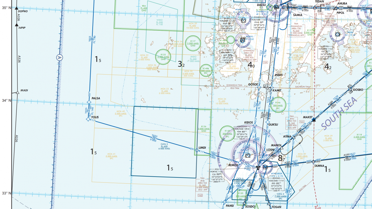 An example of an en-route chart, containing AMA information. Note that no AMA information is printed for quadrilaterals that contain only water surface. Some charts use the value of 10 (1000 ft) in such cases