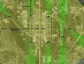 The view from overhead of typical sector coverage at a multi-runway airport might look like the illustration below