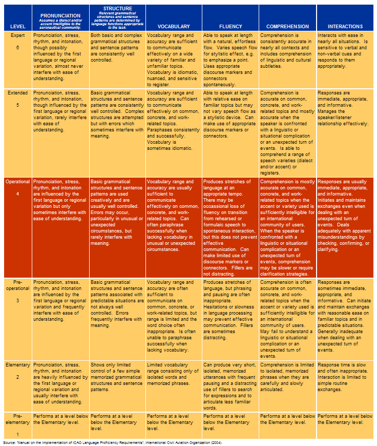 As noted above, ICAO requires that language skills of pilots and controllers rated at: