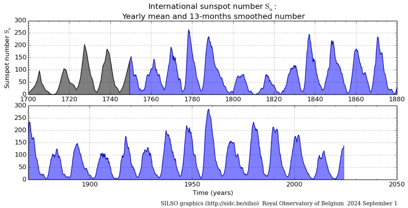 The occurrence and severity of these eruptions follows an 11-year cycle composed of a period during which the severity and probability of occurrence of eruptions are quite low (but unfortunately not equal to zero), followed by a higher solar activity period called the solar maximum. This cycle can be characterized using the sun spot number (SSN), which is the arithmetic sum of the visible dark spots on the solar surface. As this parameter is quite easy to determine, it has been recorded since 1749.