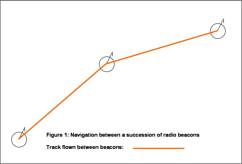 The simplest form of navigation involves flying a direct track between a succession of VOR or NDB beacons which lie on or close to the desired track (see Figure 1.) This is the form of navigation employed in conventional airways navigation. The magnetic track and distance betwen successive beacons is measured and the calculated heading is flown, with corrections to allow for the effect of wind, until the next beacon is reached. Distance (and elapsed time) to the next beacon is read from DME or calculated by dead reckoning.