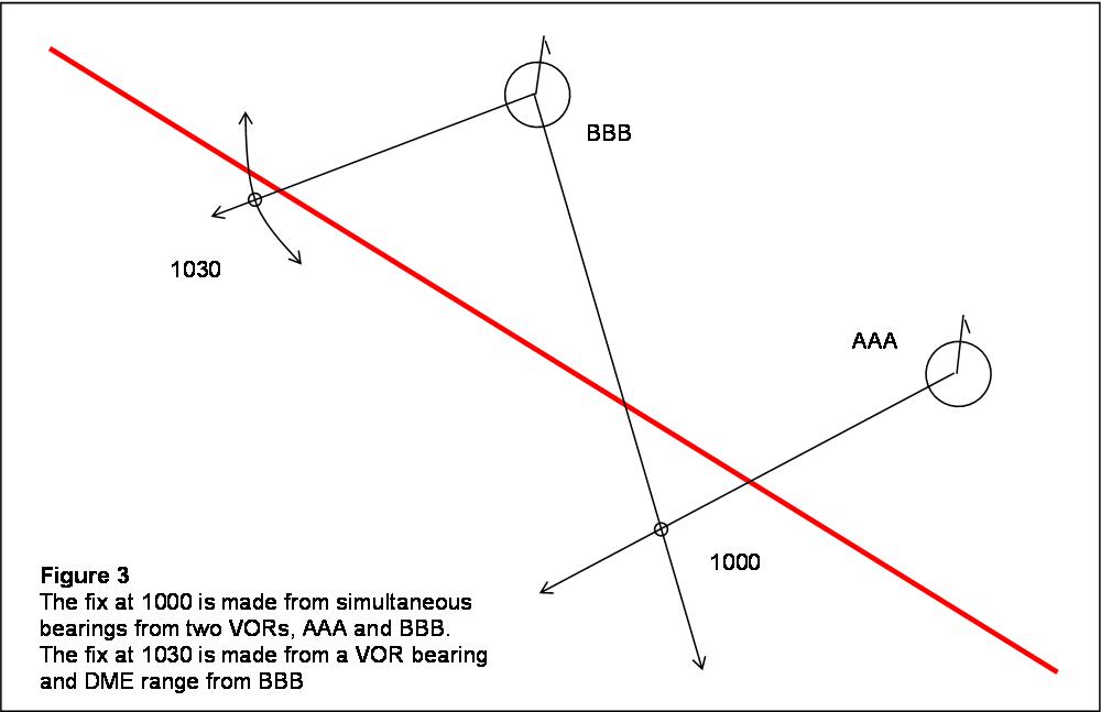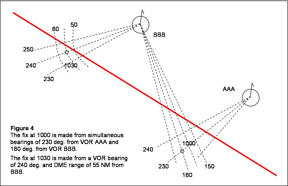 In practice, the simplest way of using method 2 is to pre-plot position lines during pre-flight preparation and compare actual bearings or DME ranges with pre-plotted lines (see Figure 4).