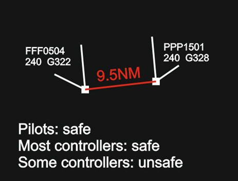 Controllers providing service in which traffic separation is prescribed will see safety as compromised if there is an (imminent) loss of separation. However, prescribed separation minima may vary both within and between countries and this can lead to different controller behaviour (see Example 5).