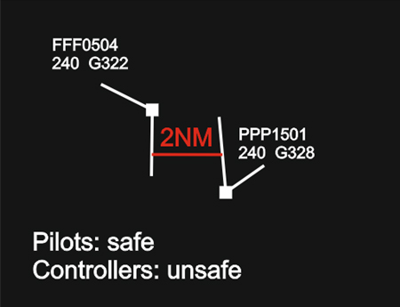 Example 6: Although controllers would consider the situation as a loss of separation, the pilots would most likely assume that there is no safety hazard, especially in VMC and when there is visual contact with the other aircraft. Also, there will be no TCAS RA.
