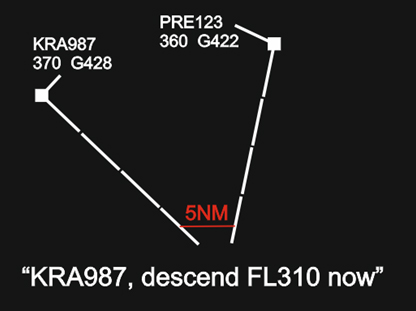 Example 5: This situation will be considered safe if the horizontal separation minimum is 5NM. If the minimum is 10NM however, an incident investigation may follow. Depending on local regulations and other factors it is possible that this situation would be assessed as a serious incident since there is neither vertical nor horizontal separation between the aircraft and at least one of the separation minima (vertical) has been breached by more than 50%).